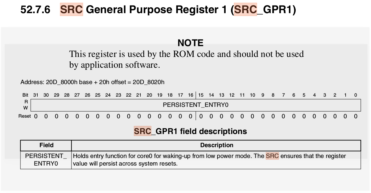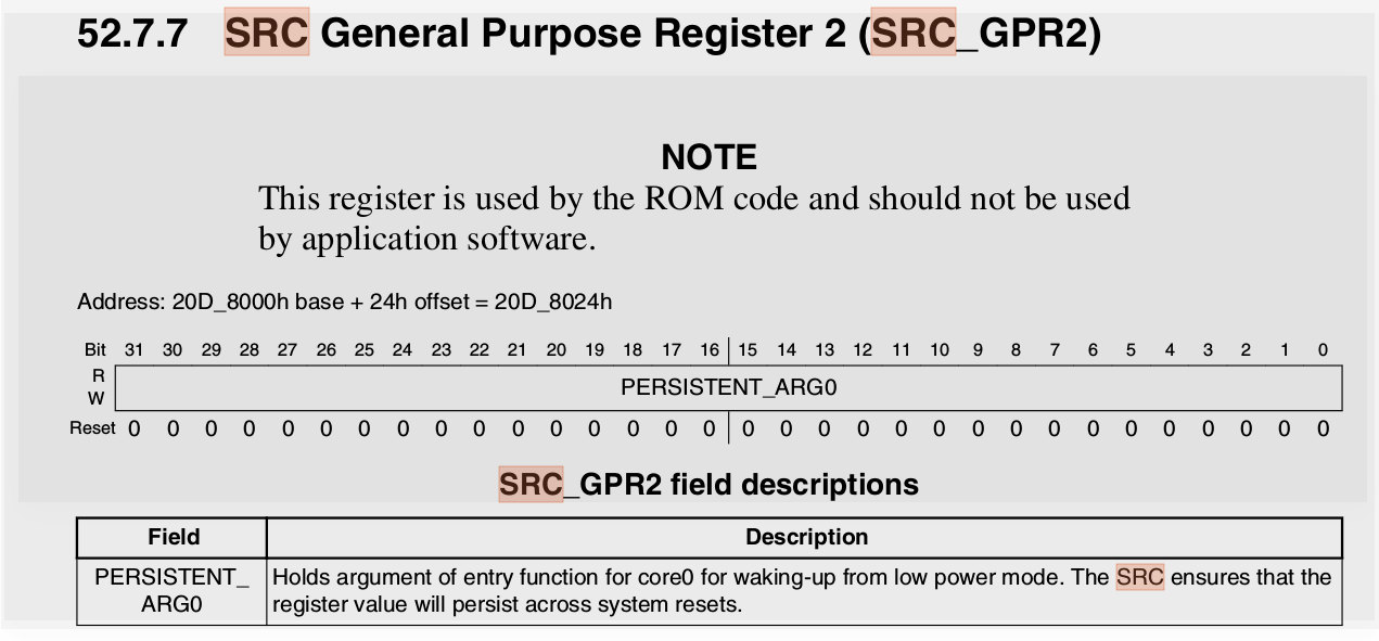 SRC_GPR1为睡眠后中断发生时跳入的地址,SRC_GPR2为相关参数