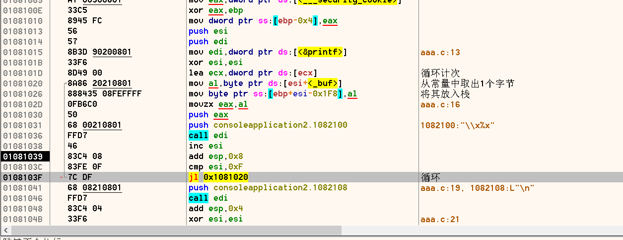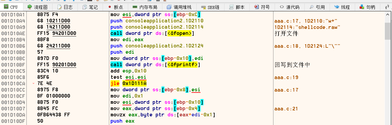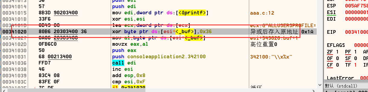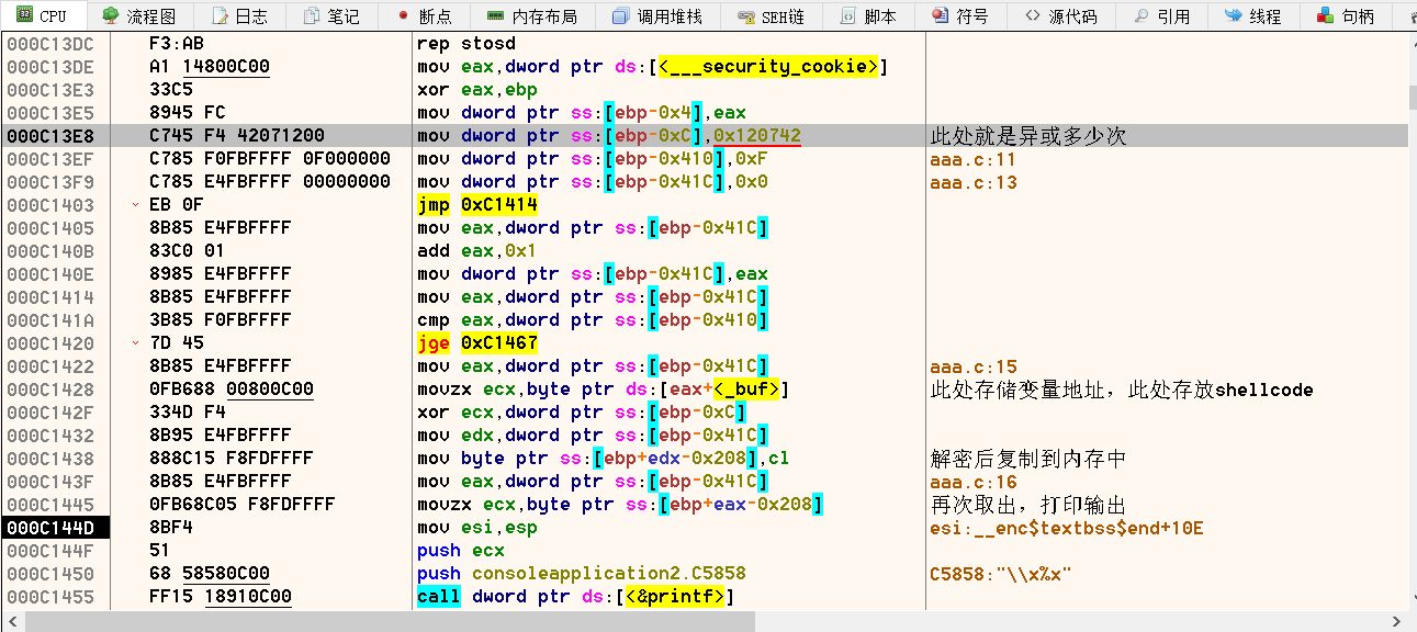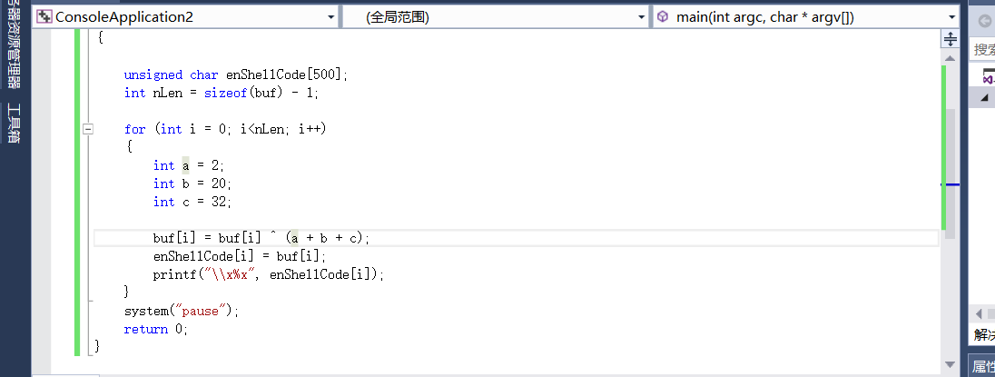 {int password = 1025;unsigned char enShellCode[500];unsigned char deShellCode[500];int nLen = sizeof(buf)-1;for (int i = 0; i 编译debug版本,可自行拖入调试器内观察参数变化,可以看到如下所示的代码;