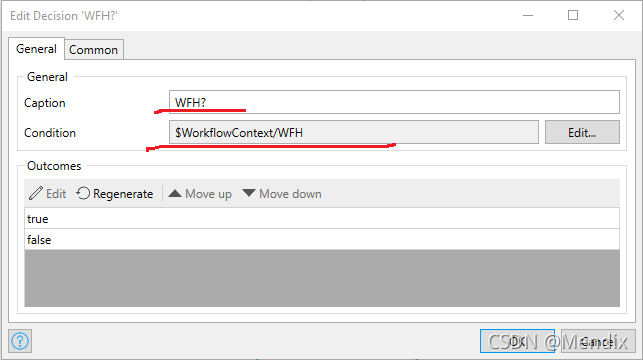 双击Decision在Condition中传入$WorkflowContext/WFH(Boolean)