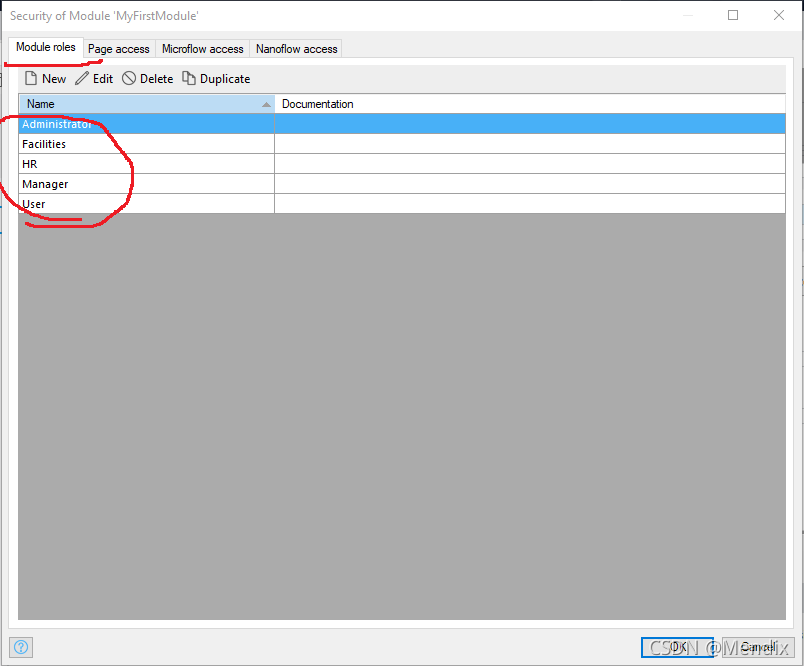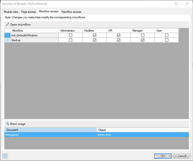 9. 接着还要在MyFirstModule-Security的Module roles设置一下角色(在该版本中WorkflowAdministrator角色被删除 )。