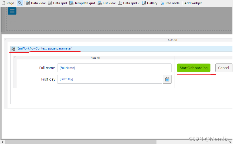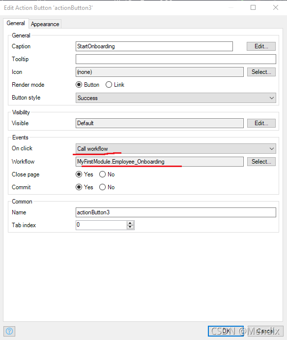 7. 然后创建一个新页面,关联我们刚刚创建的实体。创建一个button命名为StartOnboarding,其On click下拉选择Call workflow操作,然后创建一个工作流Employee_Onboarding。