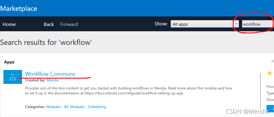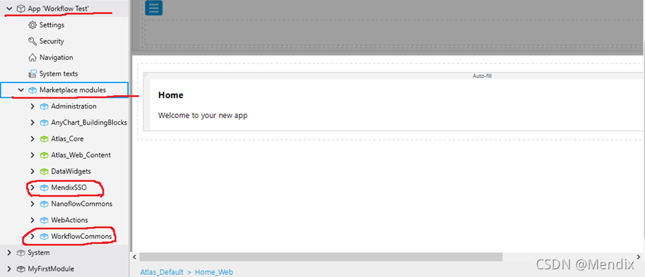 1、首先,我们新建一个项目‘Workflow Test’,然后从Marketplace中下载Workflow Commons和MendixSSO Atlas Core两个组件。