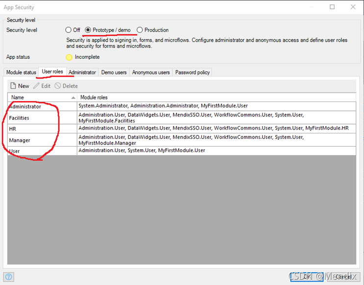 8. 然后我们需要在App’Workflow Test’下配置一下App Security,创建如下角色并选择对应的User页面。