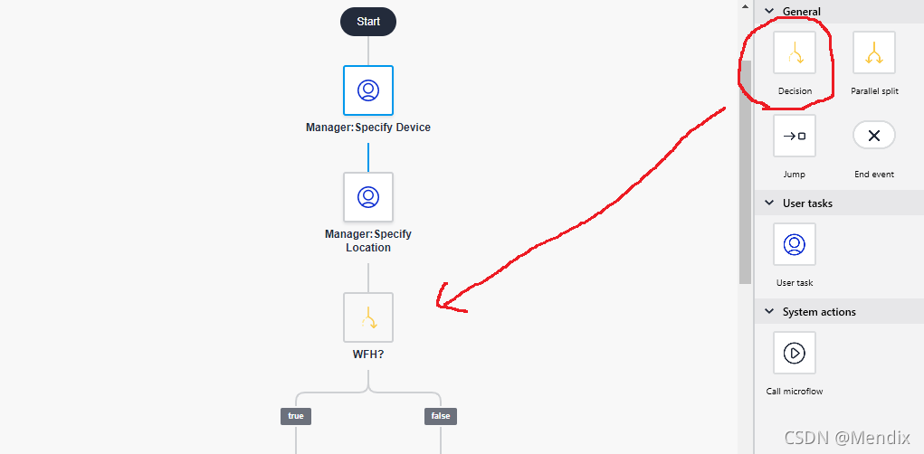 14. 接下来需要使用一个Decision,来决定入职员工是否在家办公,系统会自动生成true和false两个选项。