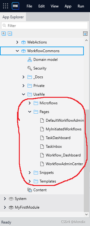 3. 在Workflow Commons组件下的UseMe文件夹中我们可以看到它里面有专门的微流、页面、代码片段及模板。