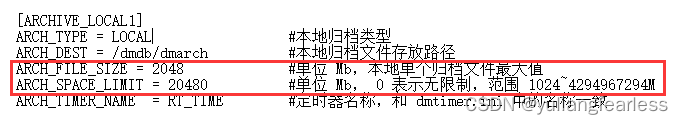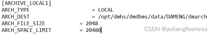 上面提到的可动态修改是指 DBA 用户可以在数据库服务器运行期间,通过调用系统过程,执行以下命令: SP_SET_PARA_VALUE()、SP_SET_PARA_DOUBLE_VALUE()和 SP_SET_PARA_STRING_VALUE()对参数值进行修改。 该配置文件主要用来配置归档,在单实例下,一般配置为本地归档,并建议分配独立的磁盘存放归档文件,设置每个归档文件 2 GB 大小,并根据磁盘情况设置归档上限,以免撑满磁盘。如下图所示: