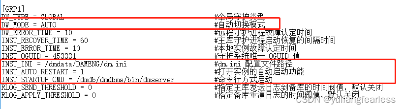 dmwatcher.ini 是集群守护进程的配置文件,其中请注意这些参数 DW_MODE,INST_AUTO_RESTART,INST_INI 和 INST_STARTUP_CMD ,以避免不必要的麻烦,详细配置如下: Copy cd /dmdata/实例名/ vi dmwatcher.ini