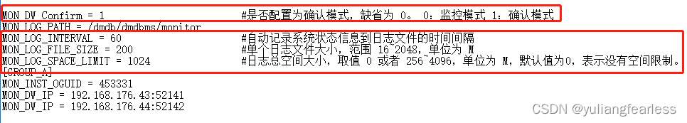 dmmonitor.ini 是守护集群的监视器的配置文件,其中有需要确认的是参数 MON_DW_Confirm,MON_LOG_INTERVAL,MON_LOG_FILE_SIZE和MON_LOG_SPACE_LIMIT ,详细配置如下: Copy cd /dmdata/实例名/ vi dmmonitor.ini