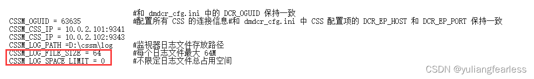 dmcssm.ini 是共享存储集群的监视器的配置文件,其中需要注意的参数为 CSSM_LOG_FILE_SIZE 和 CSSM_LOG_SPACE_LIMIT ,详细配置如下: Copy Cd /dmdb/dmdbms/cssm Vi dmcssm.ini