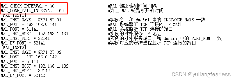 dmmal.ini 是集群数据库各个节点之前内部通讯的验证文件因此需要各个节点配置严格保持一致不然会影响集群的运行, 建议参数 MAL_CHECK_INTERVAL 和 MAL_CONN_FAIL_INTERVAL 修改为 60 s ,以避免因为网络延时出现脑裂的情况,详细配置如下: Copy cd /dmdata/实例名/ vi dmmal.ini