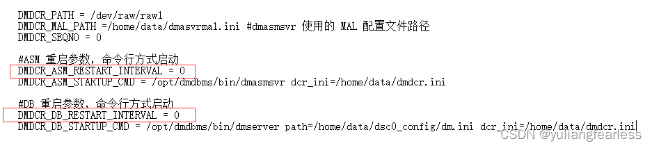 | DMDCR_ASM_RESTART_INTERVAL | 60 | DMCSS 认定 DMASM 节点故障重启的时间间隔(取值 0~86400 s),DMCSS 只负责和 DMDCR_SEQNO 节点号相等的 DMASM 节点的故障重启如果配置为 0,则不会执行自动拉起操作。 建议值为 60 | 静态 |