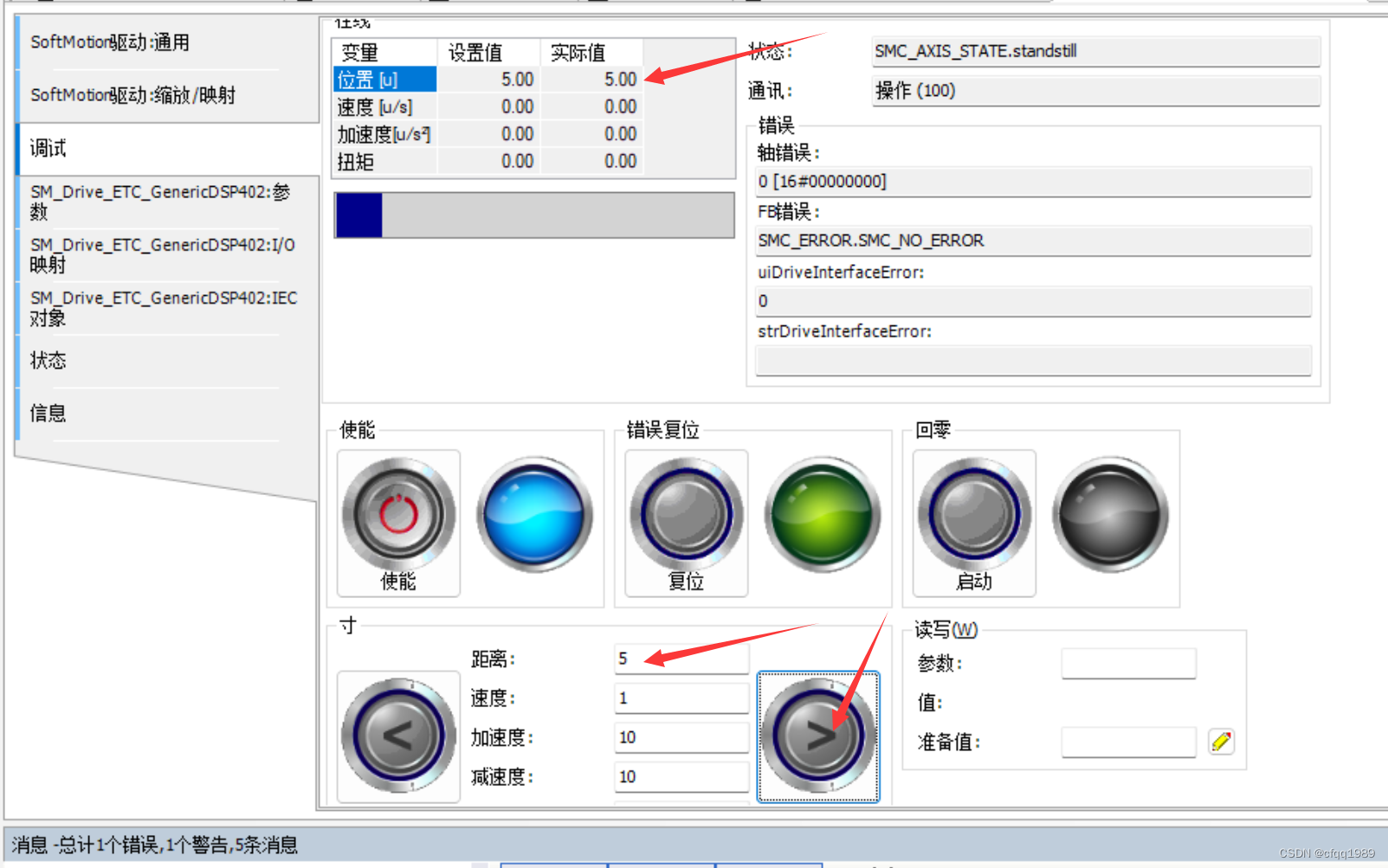 距离设置5,按住按钮,电机正好转1圈。 速度:【r/s】转/秒 //只需要填实际速度【r/s】
