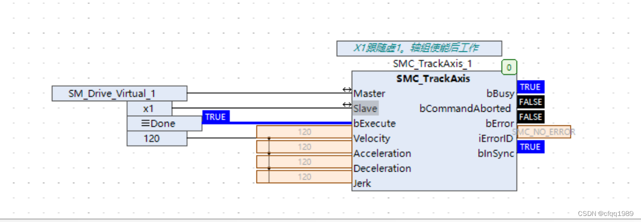 直接轴【跟随】 SMC_TrackAxis (FB)// 从轴要使能状态下bExecute上升沿:开始执行功能块。Velocity 最大速度[u/s]Acceleration 最大加速度,单位为[u/s²]。Deceleration 最大减速度,单位为【u/s²】。Jerk 起跳速度,单位为【u/s³】。//========================================