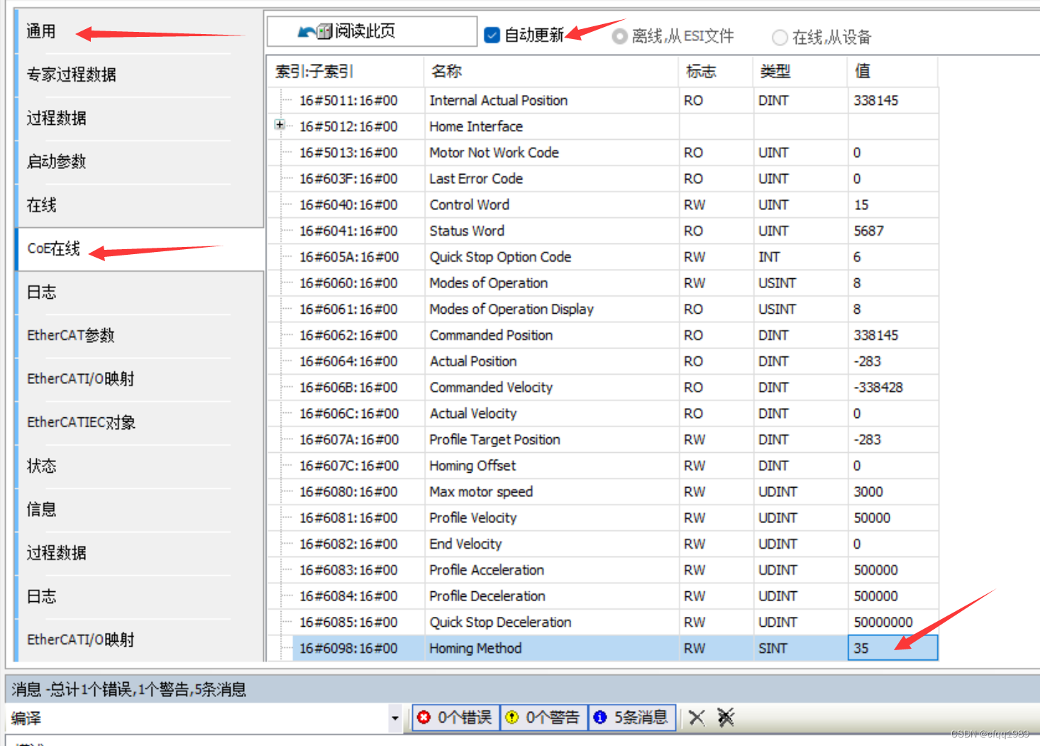 点击通用》勾选专家模式》点击COE在线》设置0x6098=35;
