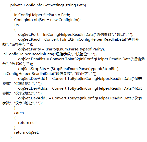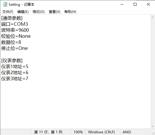 1、配置信息管理:配置信息主要包括通信端口号、波特率、仪表1地址代号、仪表2地址代号、仪表3地址代号等,这里采用ini的方式进行存储,通过调用底层API的方式读取配置信息,封装成对象。ini文件存储形式如下所示: