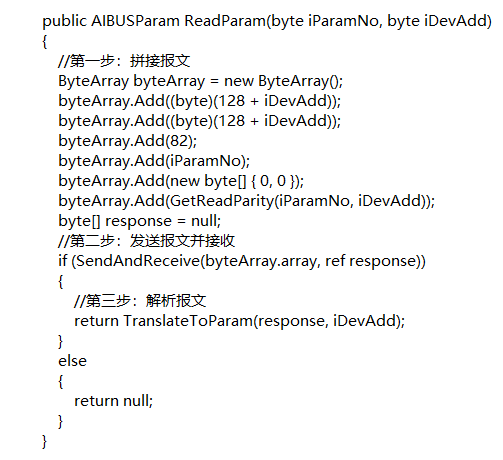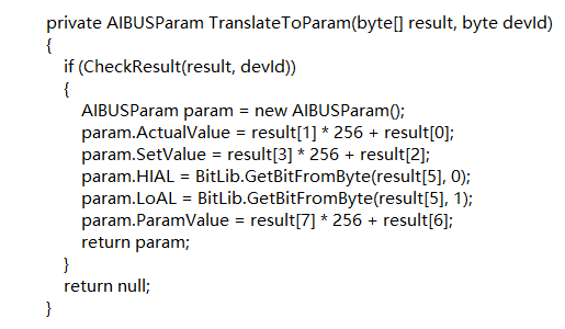 读取参数:参考协议中的读取报文,读取参数将地址代号与参数代号作为参数,然后将返回值解析成一个AIBUSParam对象,如下所示:
