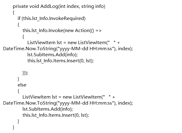 3、实时日志显示:系统运行过程中的各种状态都将通过日志的形式进行展示,这里采用ListView+委托的方式来实现,代码如下所示:
