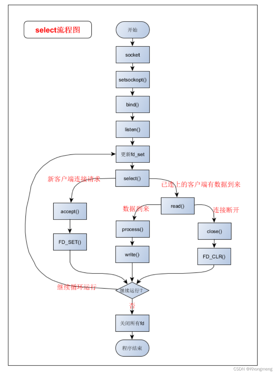 1、select()多路复用实现网络socket服务器多路并发的流程图及代码: