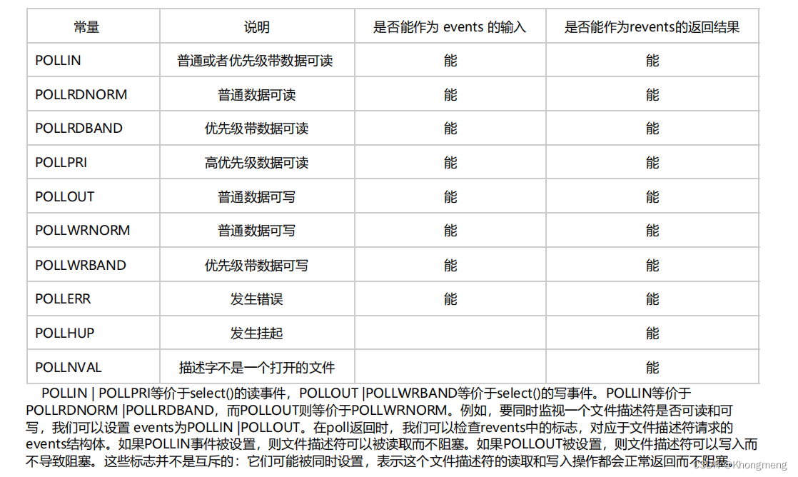 第一个参数用来指向该结构体类型的数组,每一个pollfd结构体指定了一个被监视的文件描述符,指示poll()监视多个文件描述符,每个结构体的events域是监视该文件描述符的事件掩码,由用户来设置这个域。revents域是文件描述符的操作结果事件掩码,events域中请求的任何事件都可能在revents域中返回。下表列出指定 events 标志以及测试 revents 标志的一些常值: