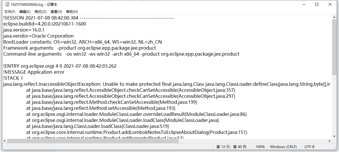 而同事的jdk使用的是1.8,jdk8及以下制作的库运行在jdk9以上会自动被标识为未命名模块,因此笔者猜测是eclipse的版本太高没有识别到lombok的两条配置,解决方法也很简单,在eclipse.ini中加入如下配置: