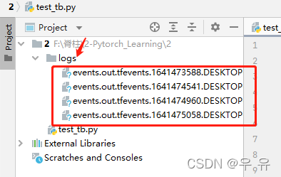 Tensorboard: SummaryWriter类(pytorch版) :大意是将条目直接写入 log_dir 中的事件文件以供 TensorBoard 使用(`SummaryWriter` 类提供了一个高级 API,用于在给定目录中创建事件文件,并向其中添加摘要和事件)。tensorboard --logdir=XXXX(XXXX就是你要求tensorboard writer把文件写入的那个地方在上图中就是logs),为了防止端口冲突,可以设置一个特别的端口,就是在上面的命令后再加一个 --port=端口