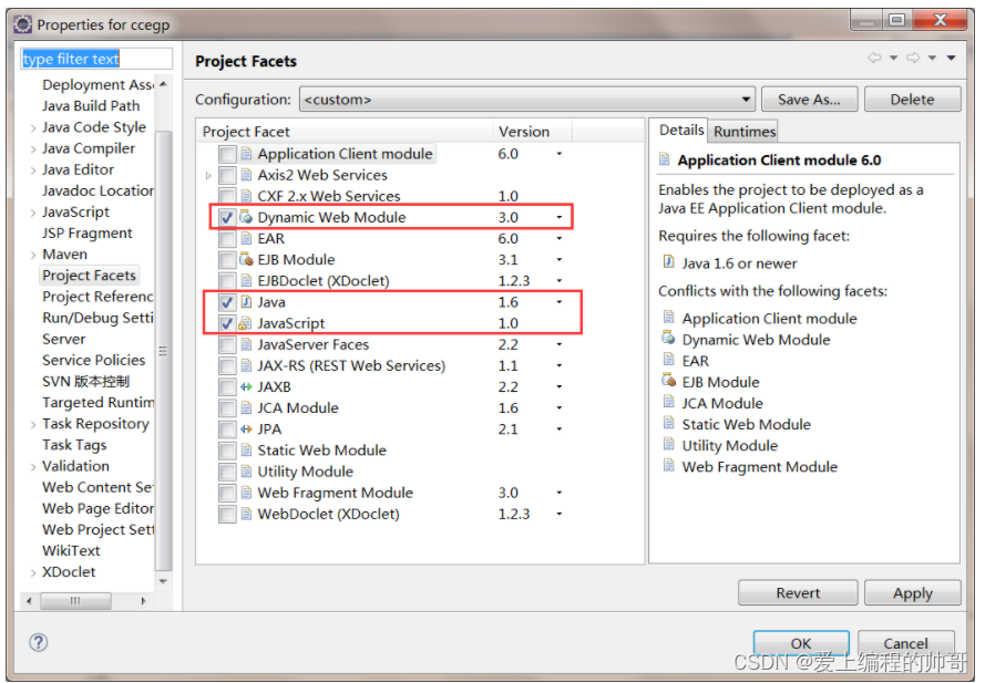 二、 若还是不行,则右键项目--> properties--> Projects Facets把下图的三个勾给打上。点击