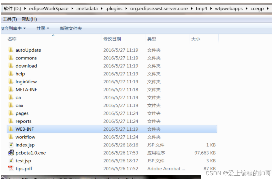如果能在打开的文件夹中看到文件和ecplise中的一一对应,那么就说明加载成功了。左图中的WEB_INF文件夹里应包含classes文件夹,并且内容和右图中的build下的classes里的一致。(因为我的eclipse编译路径设为ccegp/build/classes,不是ccegp/web/WEB_INF/classes)
