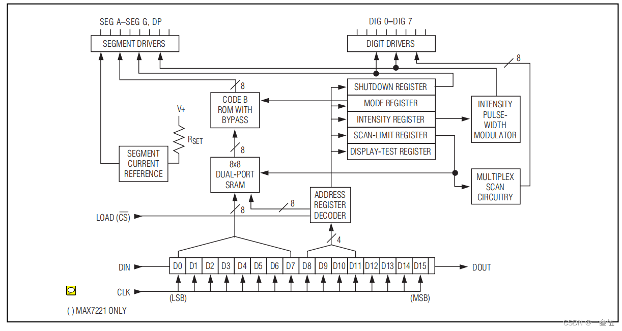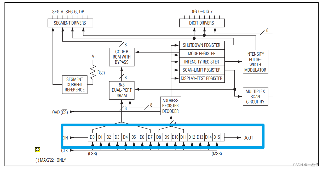 这样构成了一个完成的数据格式,那级联就是把一颗MAX7219的DOUT接到另一颗芯片的DIN,就构成了两个串联的移位寄存器,如下图所示。