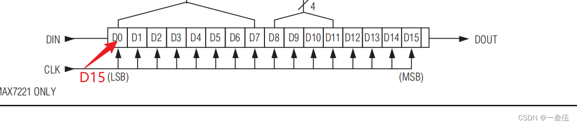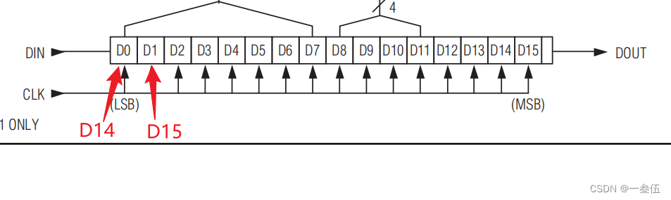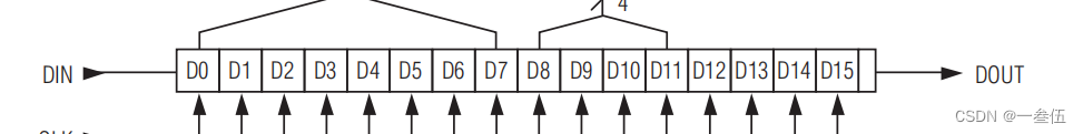 移位寄存器的功能很简单,以上图举例,就是DIN每进来一个数据,就把所有的数据往后推一格。比如D15是第一个被传进来的,那现在整个移位寄存器中的数据,如下图。