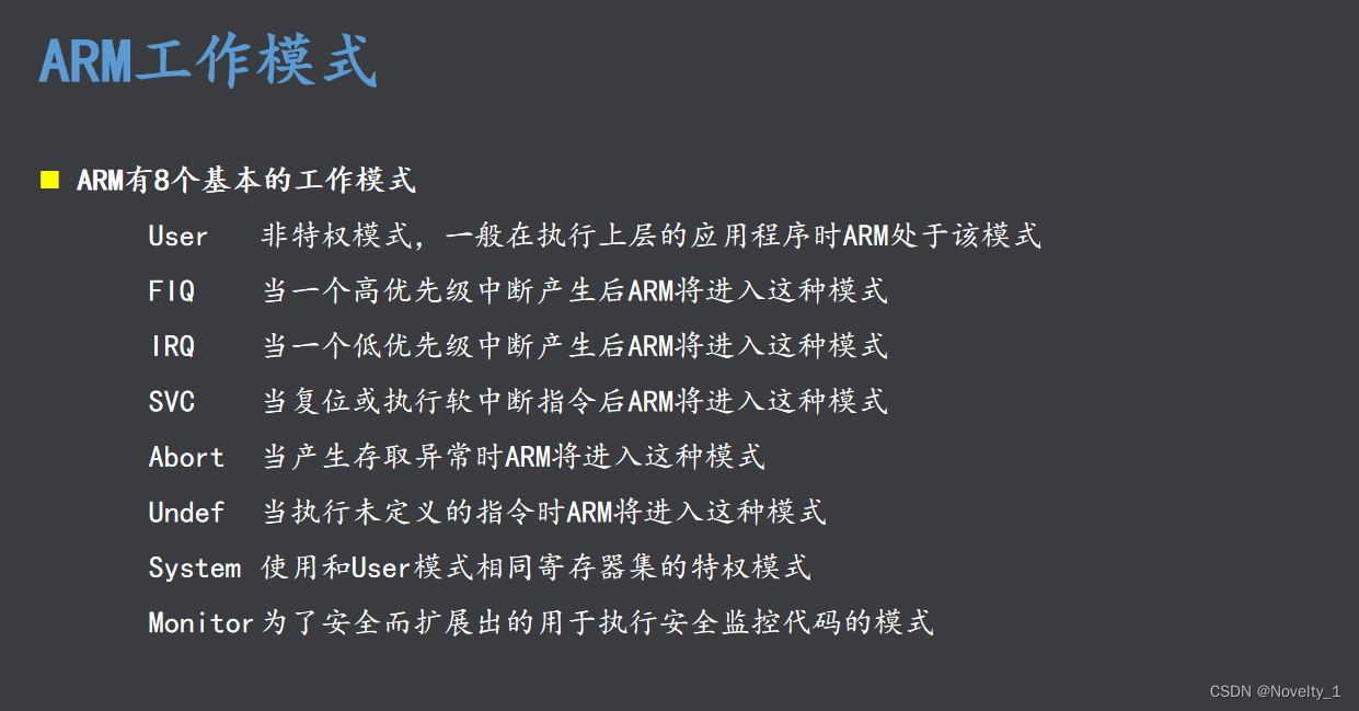 ARM处理器支持多种工作模式,其中一些常见的工作模式包括以下几种: