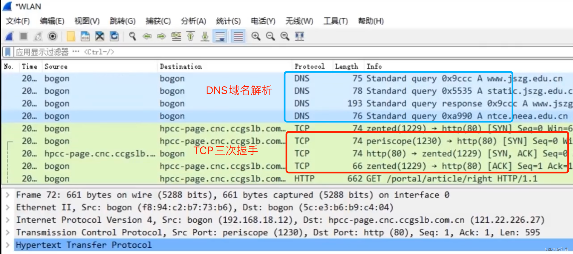第一次:A给B发送信息,想验证自己的网络是否正常;使用抓包工具可以清晰的看到一次请求的三次握手过程: