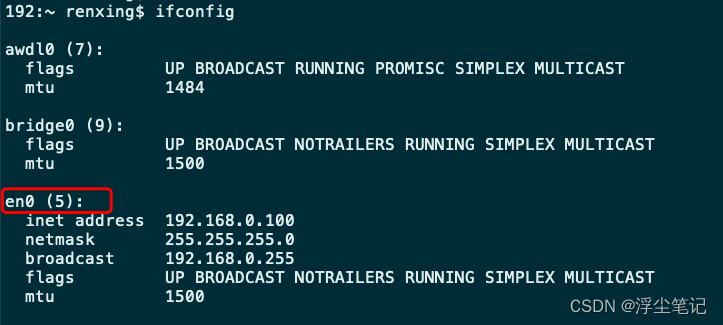 使用 ifconfig 命令查看当前默认网卡名称,一般是 eth0,我本机是 en0