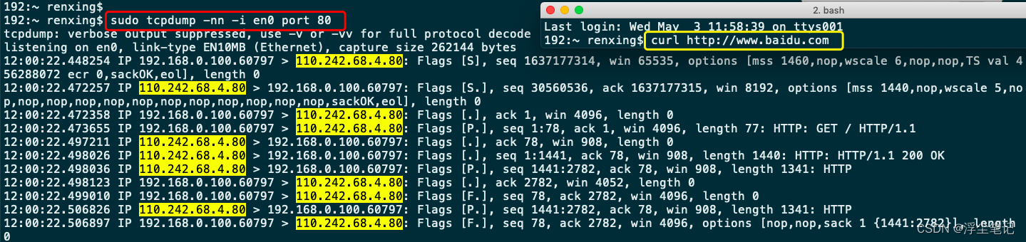 然后使用下面的命令抓包查看TCP的三次握手和四次挥手: