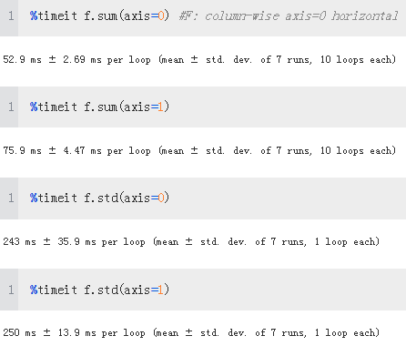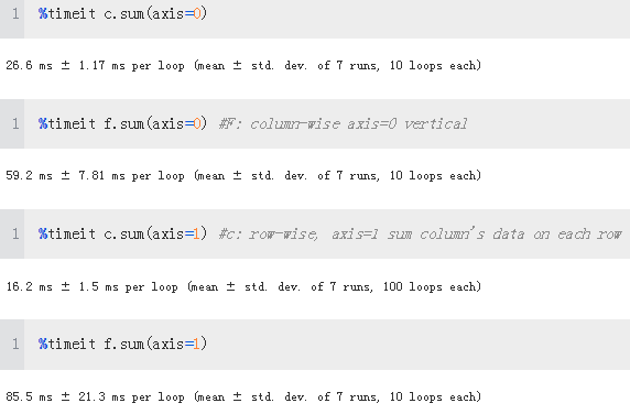 Calculating sums over the first axis is roughly two times slower than over the second axis.