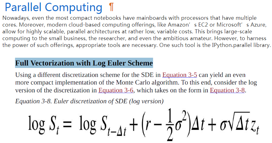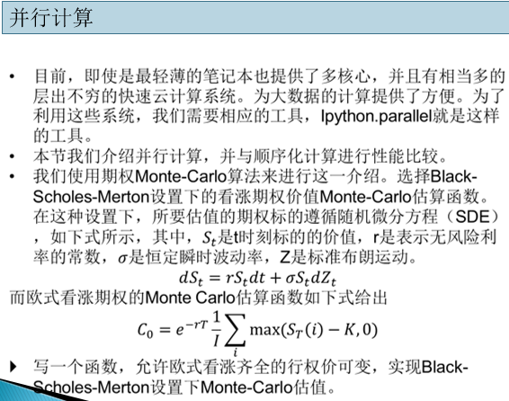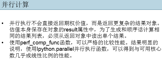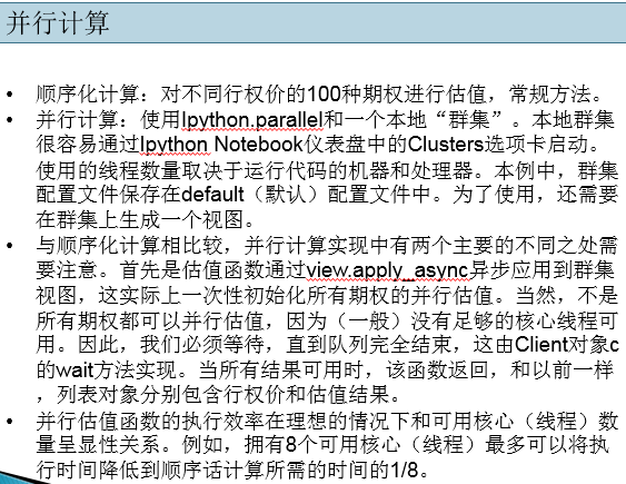•金融学中许多问题可以应用简单的并行化技术,例如,在算法的不同实例之间没有共享数据时,Python的multiprocessing模块可以高效的利用现代硬件架构的能力,一般不需要改变基本算法或者并行执行的Python函数。