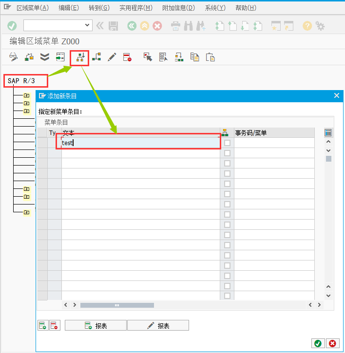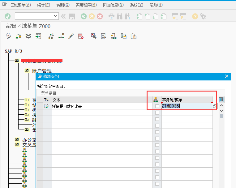 自定义菜单保存完之后,可以继续进行文件夹和事务代码的添加。