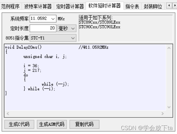 先用软件延时函数生成一个20ms的函数用于按键消抖,注意系统频率和指令集别选错了