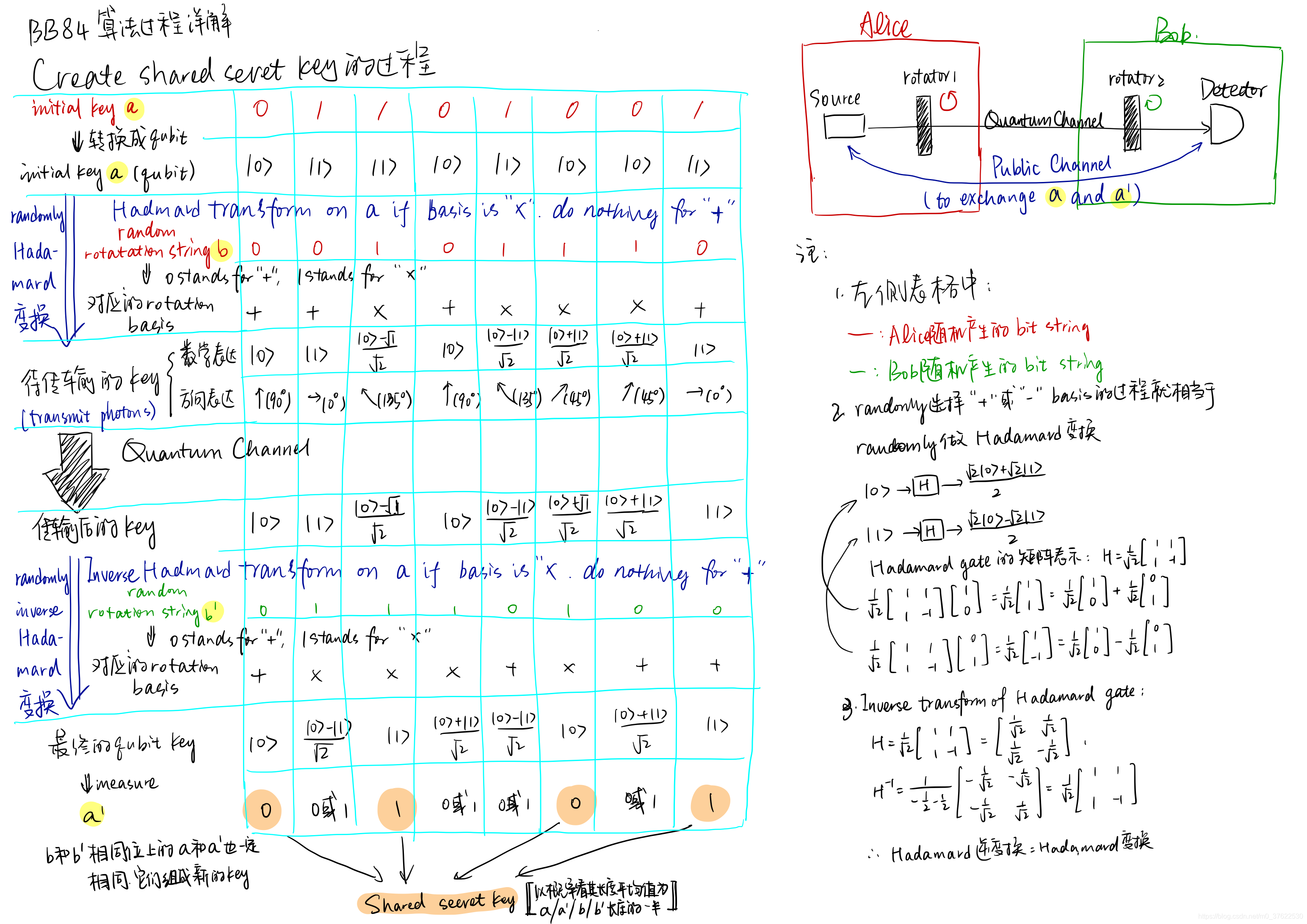 BB84几乎是最popular的一个量子密钥分发的协议了,这里给出一个BB84产生和分发密钥的例子,用表格的形式画出,可能会更加易于理解。BB84的实现过程不再赘述了,有很多资料写的很清楚了,感兴趣的同学可以参考BB84 protocol的Wikipedia page和教材Quantum Computation and Quantum Information(作者Neilson),P586起。
