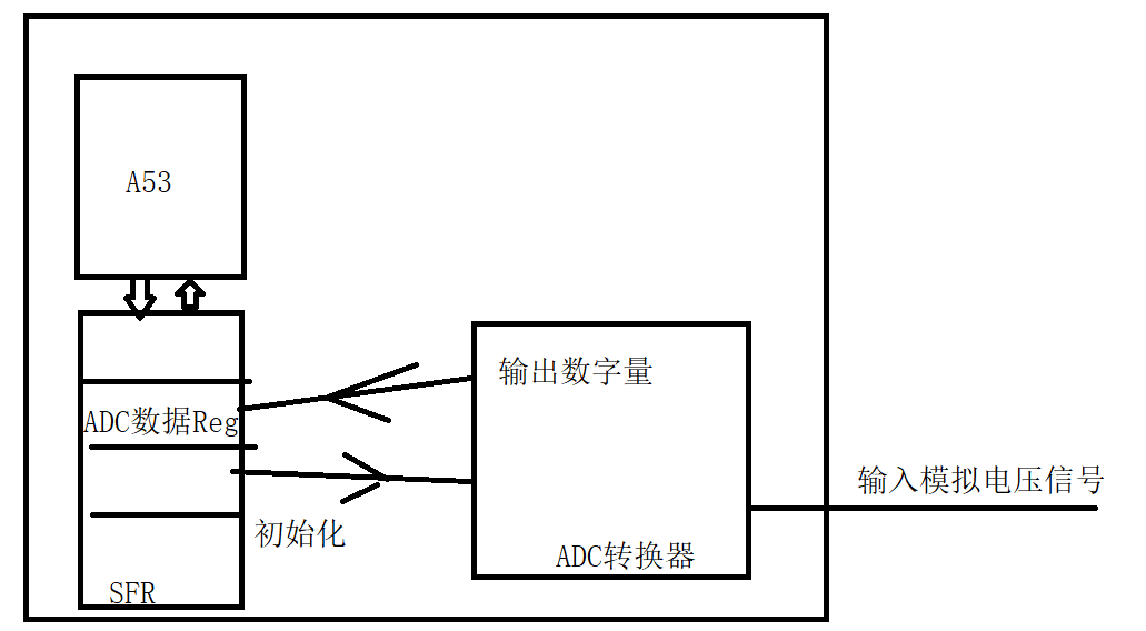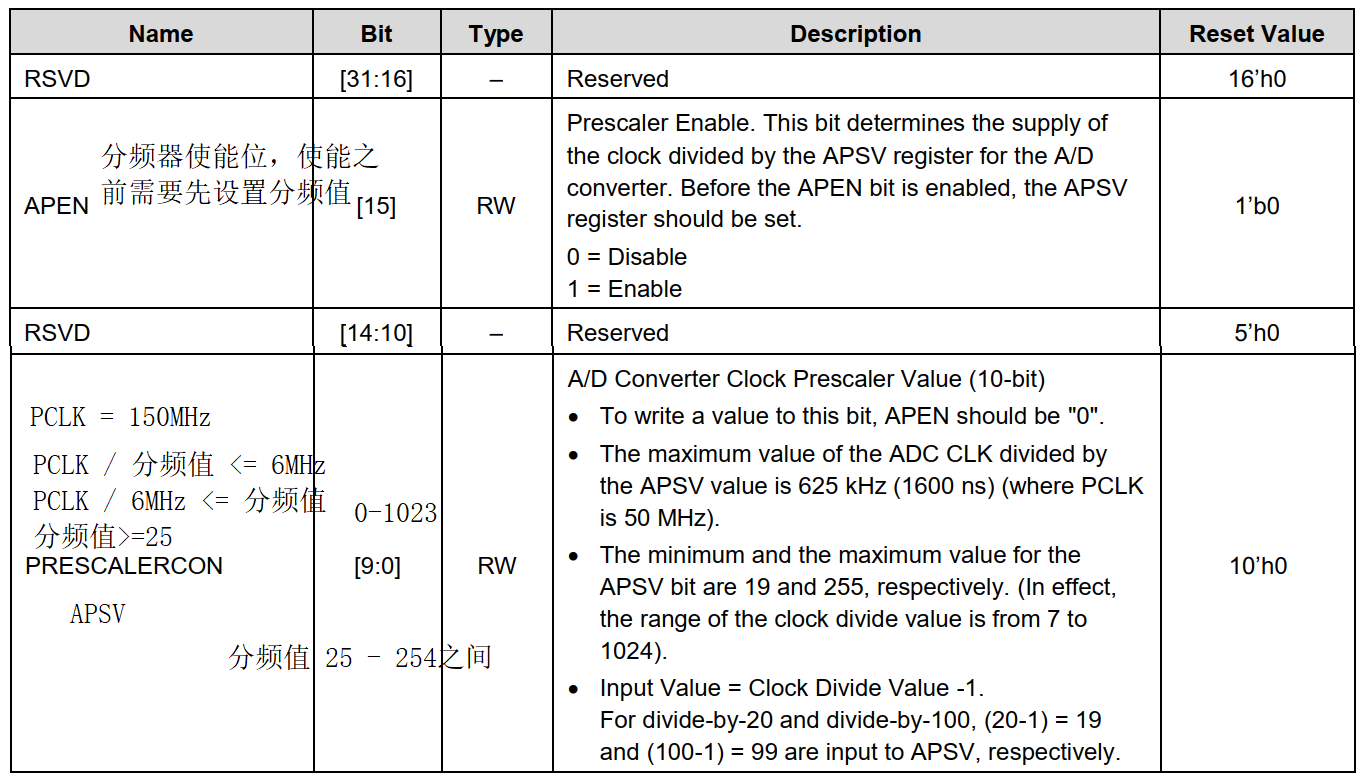 {// 4.9.4.2 IP_RESET_REFISTER0/1/2unsigned int *ip_reset1 = (unsigned int *)0xC0012004;*ip_reset1 = *ip_reset1 & (~(0x1 << 28));*ip_reset1 = *ip_reset1 | (0x1 << 28);//1.设置读取转换结果的延时时间 ADCCON[13:10] = 0b0000ADCCON &= (~(0xF << 10));//2.开启电源源之后,延时几个周期可以开启ADC转换 //a)ADCCON[9:6] =ADCCON 0x6ADCCON &= (~(0xF << 6));ADCCON |= (0x6 << 6);//3.ADC输入的通道选择 ADCCON[5:3] = 0b00 ADCCON &= (~(0x7 << 3)); //4.开启ADC的电源 ADCCON[2] = 0b0ADCCON &= (~(1 << 2));//5.设置ADC的分频值 PRESCALERCON[9:0] = 199PRESCALERCON &= (~(0x3FF));PRESCALERCON |= (199);//6.设置ADC的分频使能位 PRESCALERCON[15] = 0b1PRESCALERCON |= (1 << 15);