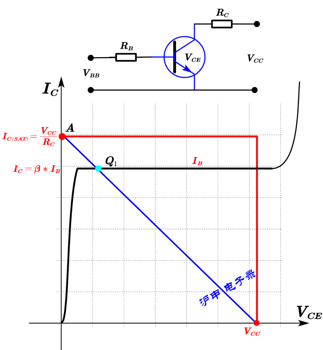 第一步,计算负载线上端点IC.SAT值,并假设三极管进入放大区。