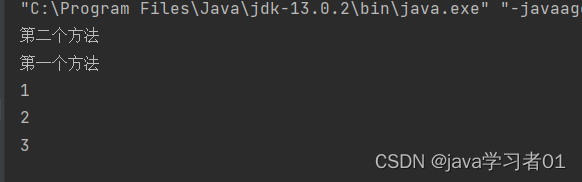 public class Param {public void method(int... i){System.out.println("第一个方法");for (int j = 0; j < i.length; j++) {System.out.println(i[j]);}}public void method(int i){System.out.println("第二个方法");}public static void main(String[] args) {Param p=new Param();p.method(1);p.method(1,2,3);}