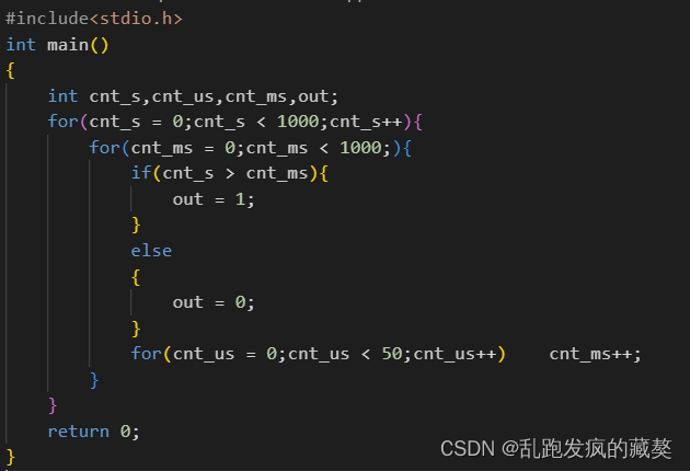 而变为Verilog描述则是三个计数器计数(其中MS计数器起始标志位为US计数器结束标志位;S计数器的起始标志位为US计数器结束标志位),而为什么需要第三个计数器是因为我们把1s分割为了1000份,因为上方分析后我们知道我们需要要把cnt_ms原本的50_000分割为与cnt_s相同的1000份,所以我们需要第三个计数器来分割50_000->1000,所以我们增加了一个计数到50的微秒计数器。此时我们则得到类似C语言中的for循环部分而我们的输出部分则再加上