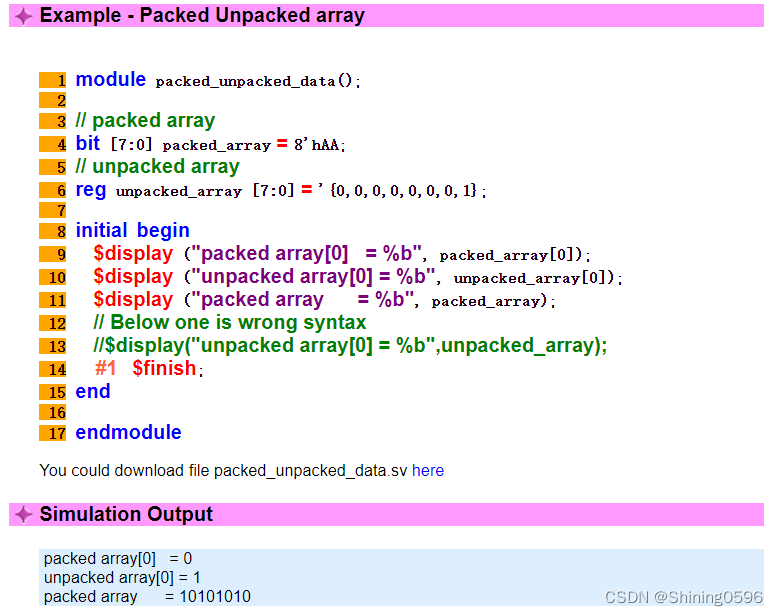 您可能已经注意到,在声明中,向量索引写在向量名称之前。这声明了数组的“打包”维度,其中位被“打包”到一个 blob 中(这在模拟器中相关,但在硬件中不相关)。解压后的维度在名称之后声明。它们通常用于声明内存数组。由于 ECE253 没有涵盖内存数组,因此我们在本课程中没有使用打包数组。