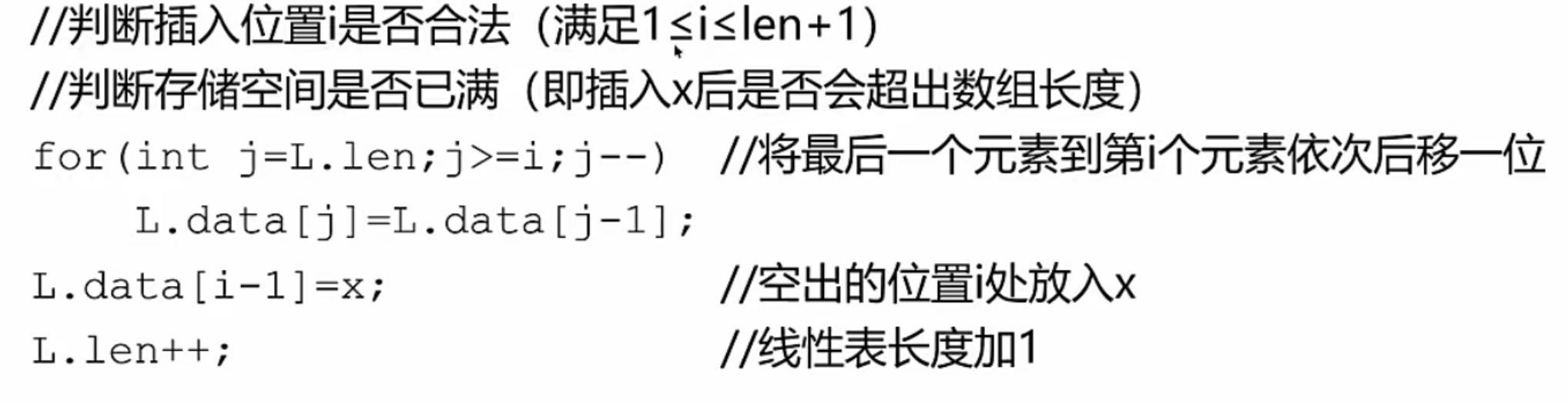 {if (i<1 || i>L.length+1)//判断插入的位置是否合法{return false;}if (L.length>MAXSIZE)//超出空间{return false;}for (int j=L.length;j>=i;j--)//移动顺序表中的元素{L.data[j]=L.data[j-1];}L.data[i-1]=elem;//插入第一个位置,访问的下标为0L.length++;//顺序表长度+1return true;