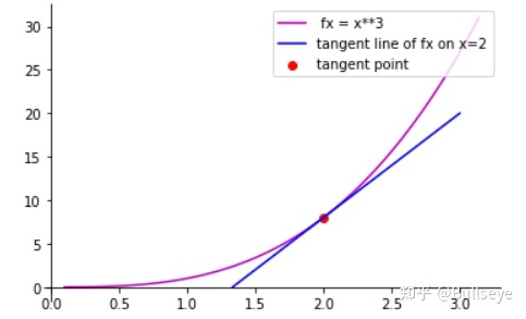 plt.legend(loc='upper right')plt.scatter(2, 2**3, c='r', label='tangent point')