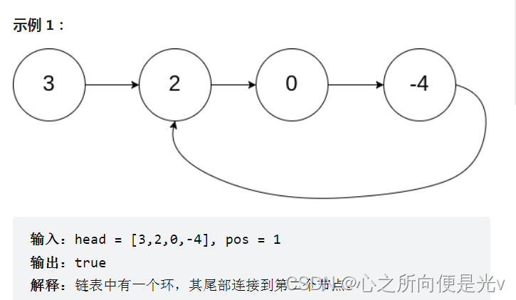 如果链表中有某个节点,可以通过连续跟踪 next 指针再次到达,则链表中存在环。 为了表示给定链表中的环,评测系统内部使用整数 pos 来表示链表尾连接到链表中的位置(索引从 0 开始)。注意:pos 不作为参数进行传递 。仅仅是为了标识链表的实际情况。