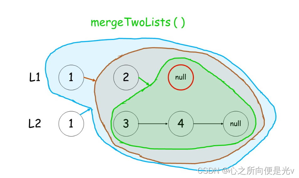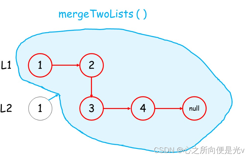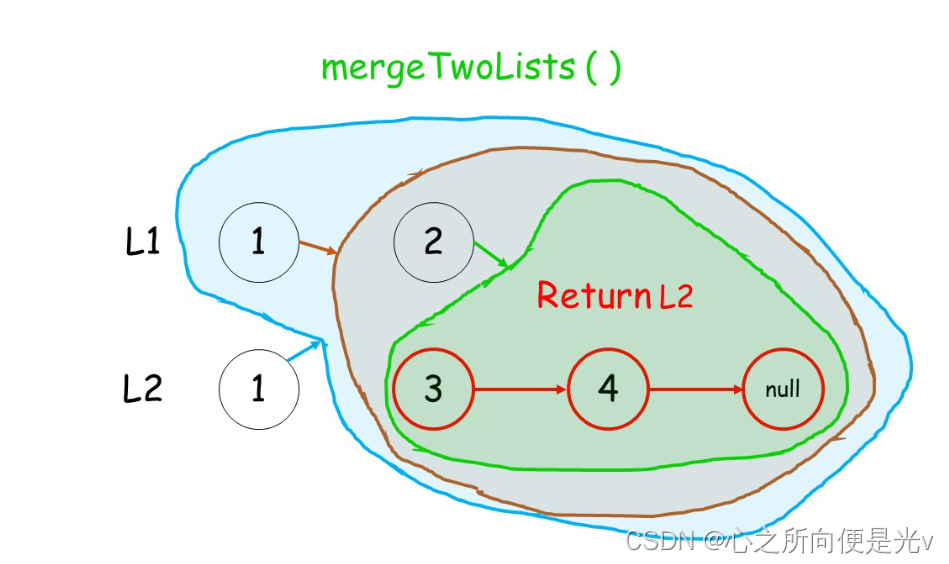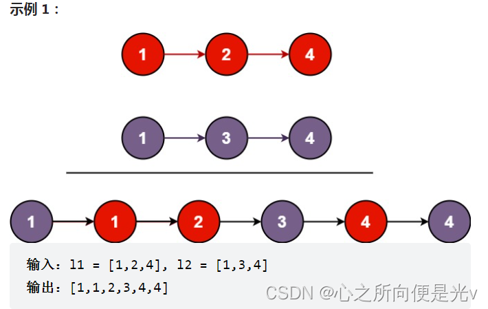 public:ListNode* mergeTwoLists(ListNode* list1, ListNode* list2) {//递归法if(list1==nullptr)return list2;if(list2==nullptr)return list1;if(list1->val <= list2->val){list1->next = mergeTwoLists(list1->next,list2);return list1;}else{list2->next=mergeTwoLists(list1,list2->next);return list2;}}