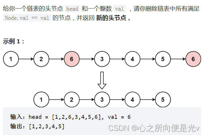 public:ListNode* removeElements(ListNode* head, int val) {//法1,创建一个虚拟头结点/*ListNode* dummyHead = new ListNode(0,nullptr);dummyHead->next=head;ListNode* cur = dummyHead;while(cur->next!=nullptr){if(cur->next->val==val){ListNode* del_node = cur->next;cur->next=del_node->next;delete del_node;}else{cur=cur->next;}}head=dummyHead->next;delete dummyHead;return head;*///法2,不创建虚拟头结点,考虑首节点为删除节点的情况while(head!=NULL&&head->val==val){head=head->next;}if(!head){return NULL;}ListNode* cur = head;while(cur->next!=NULL){if(cur->next->val==val){cur->next=cur->next->next;}else{cur=cur->next;}}return head;}
