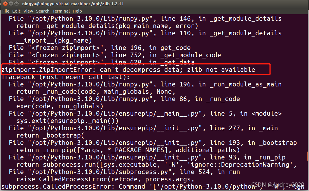 这样说明缺少zlib依赖。所以需要安装依赖zlib、zlib-level,在Ubuntu中,zlib叫做zlib1g,zlib-level叫做zlib1g-dev。命令如下:
