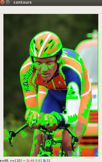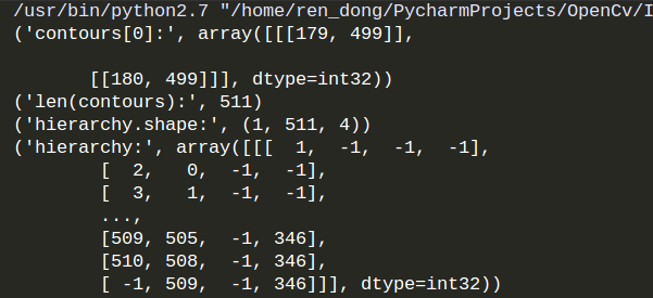 #-*_ coding:utf-8 -*- import cv2 import numpy as np '''created on Tues jan 08:28:51 2018@author: ren_dongcontour detectioncv2.findContours() 寻找轮廓cv2.drawContours() 绘制轮廓''' #加载图像img img = cv2.imread('1.jpg') cv2.imshow('origin', img) '''灰度化处理,注意必须调用cv2.cvtColor(), 如果直接使用cv2.imread('1.jpg',0),会提示图像深度不对,不符合cv2.CV_8U''' gray = cv2.cvtColor(img, cv2.COLOR_BGR2GRAY) cv2.imshow('gray', gray)#调用cv2.threshold()进行简单阈值化,由灰度图像得到二值化图像 # 输入图像必须为单通道8位或32位浮点型 ret, thresh = cv2.threshold(gray, 127, 255, 0) cv2.imshow('thresh', thresh)#调用cv2.findContours()寻找轮廓,返回修改后的图像,轮廓以及他们的层次 image, contours, hierarchy = cv2.findContours(thresh, cv2.RETR_TREE, cv2.CHAIN_APPROX_SIMPLE) cv2.imshow('image', image)print('contours[0]:',contours[0]) print('len(contours):',len(contours)) print('hierarchy.shape:',hierarchy.shape) print('hierarchy:',hierarchy)#调用cv2.drawContours()在原图上绘制轮廓 img = cv2.drawContours(img, contours, -1, (0, 255, 0), 2) cv2.imshow('contours', img)cv2.waitKey() cv2.destroyAllWindows()运行后的结果如下: